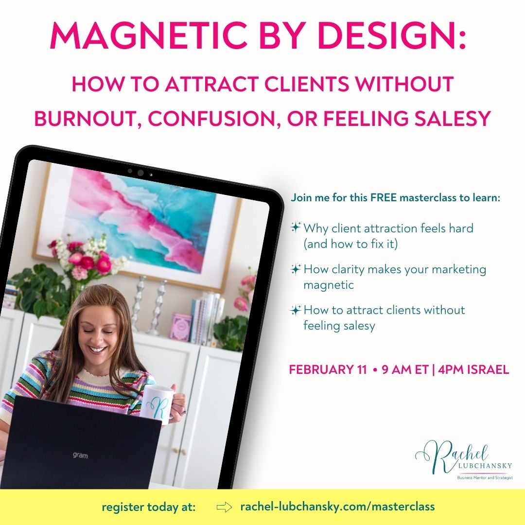 Join Magnetic by Design, a free, live masterclass — tomorrow, Feb 11 — to learn a simpler, more grounded approach to client attraction that works for you from business mentor and strategist Rachel Lubchansky.